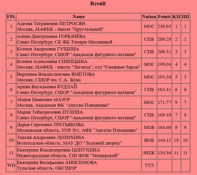 Второе место заняла Алина Горбачёва с результатом 209,28 балла. Третьей стала Ксения Гущина, получившая от судей 200,51 балла.