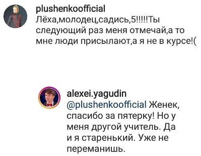 "Лёха, молодец, садись, пять! Ты в следующий раз меня отмечай, а то мне люди присылают, а я не в курсе", - написал Евгений в комментариях.
