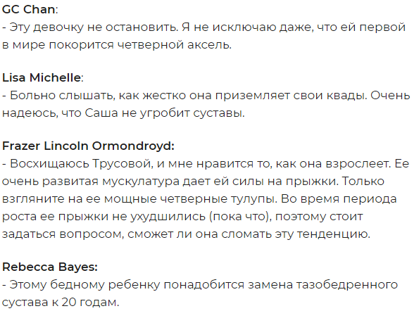Большинство комментаторов сошлись во мнении, что Александру уже не остановить, а впереди её ждёт большое будущее, однако нашлись и те, кто считают, что юная звёздочка из Южной Кореи Ю Ён исполняет риттбергер более мастеровито, чем россиянка.