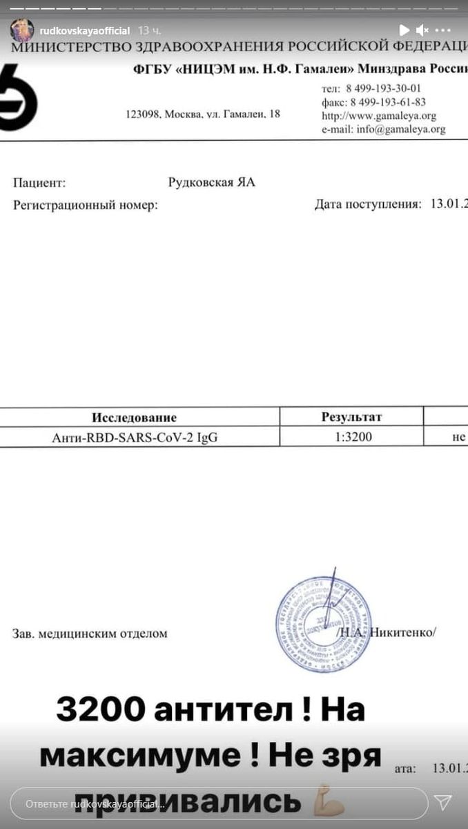 - 3200 антител! На максимуме! Не зря прививались, — написала Рудковская.