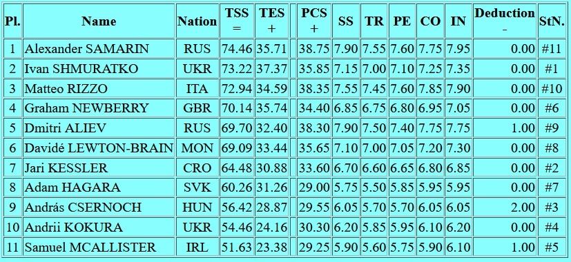 Лидирует российский фигурист Александр Самарин. На его счету 74,46 балла. Вторым идёт украинец Иван Шмуратко, набравший 73,22 балла. Замыкает тройку представитель Италии Маттео Риццо. Его прокат был оценён в 72,94 балла.