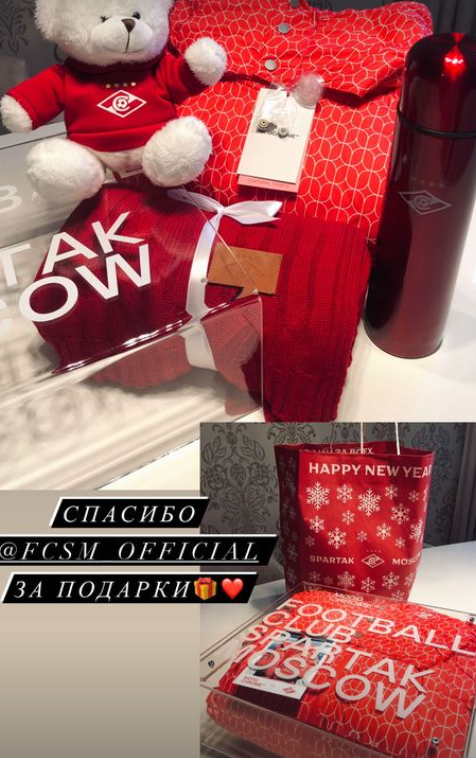 Спортсменка получает подарки в связи с наступающим Новым годом. В частности, она получили подарки от футбольного клуба "Спартак". Фигуристка показала фотографию с ними.