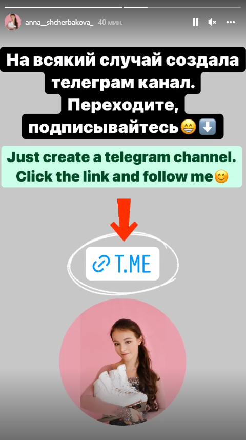 Это сделала и олимпийская чемпионка Анна Щербакова. Она оставила ссылку на свой канал в Telegram у себя в Instagram.