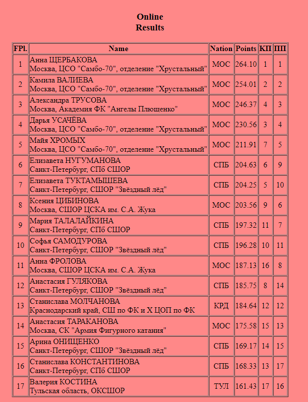 Победу уже в третий раз одержала Анна Щербакова. В сумме она набрала 264,10 балла (за произвольную программу 183,79).