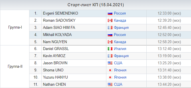 Оба представителя России, Евгений Семененко и Михаил Коляда, попали в первую разминочную группу. Семененко выступит первым в 12:33 по московскому времени, прокат Коляды будет четвёртым в 12:52 по московскому времени. Завершит короткую программу американец Нейтан Чен.
