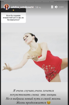 Аделина Сотникова ответила на вопрос, хотела бы она вернуться в фигурное катание. По словам Сотниковой, она скучает по фигурному катанию и по тем эмоциям, которые даёт этот вид спорта, но она выбрала другой путь в жизни..