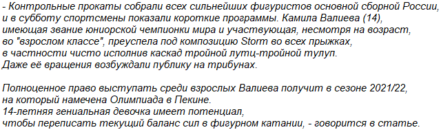 Известное японское издание Sponichi Annex, комментируя контрольные прокаты сборной России, которые накануне состоялись в Москве, не поскупилось на комплименты в адрес 14-летней Камилы Валиевой