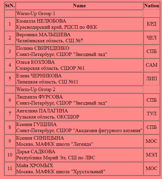 Стали известны стартовые номера фигуристок. Первой на лёд выйдет Камилла Нелюбова. Дарья Садкова, завоевавшая бронзу в Казани, выйдет на лёд десятой. Последней 11-й на лёд выйдет ученица Этери Тутберидзе Майя Хромых.