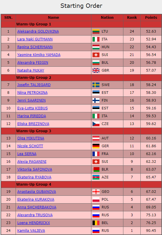 Все три спортсменки выйдут в заключительной четвёртой разминке. Анна Щербакова появится на льду под 21-м номером, Александра Трусова выйдет 22-й, а Камила Валиева – 24-й.