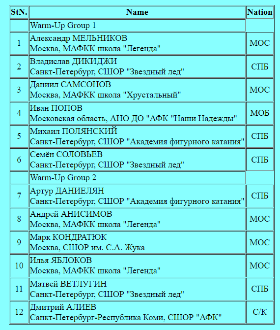 Sport.ru/ Фигурное катание. В субботу, 25-го ноября, в Москве пройдёт один из дней шестого этапа Гран-при России по фигурному катанию. В частности, мужчины выступят с короткими программами. Стали известны стартовые номера.