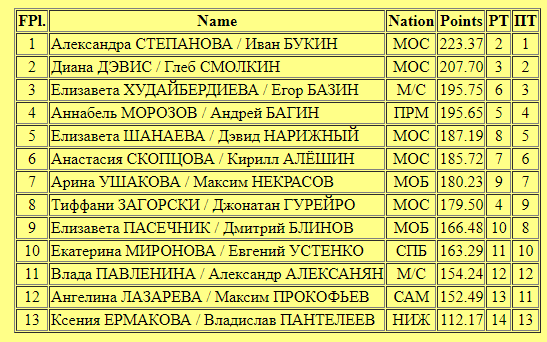 Победу одержали Александра Степанова и Иван Букин. На их счету 223,37 балла. Второе место заняли Диана Дэвис и Глеб Смолкин, набравшие 207,70 балла. Замкнули тройку Елизавета Худайбердиева и Егор Базин. Они набрали 195,75 балла.