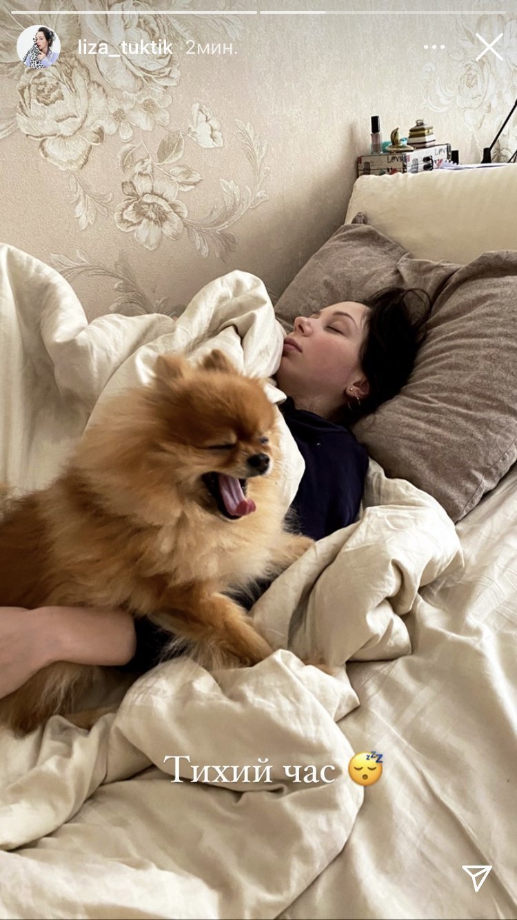 Спортменка опубликовала в "сторис" Instagram фото, где она спит вместе со своей собакой Коко.
