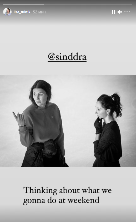 Это снимок с эстонской фигуристкой Синдрой Криисой, сделанный на льду на сборах в Куршевеле. У Туктамышевой и её коллеги довольно серьёзное выражение лиц. Поэтом фигуристка подписала фото Думаем о том, что будем делать на выходных.