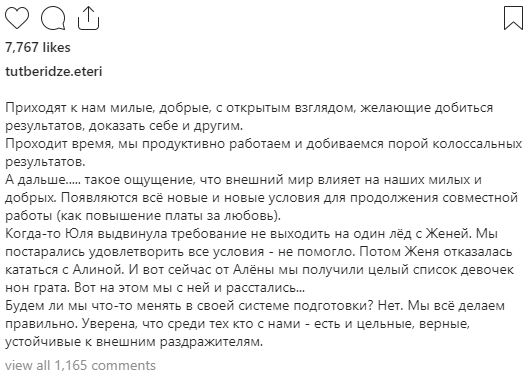 Уход действующей чемпионки Европы подтвердила сама Тутберидзе (на фото), опубликовавшая соответствующий пост в инстаграме.