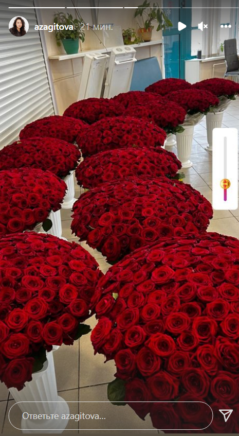 Загитова показала, что ей подарили 14 огромных букетов роз.