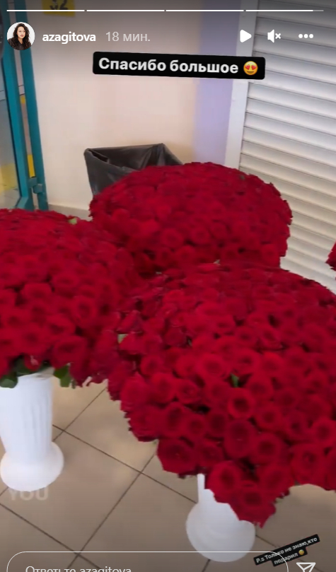 Загитова показала, что ей подарили 14 огромных букетов роз. Правда, Алина не знает, кто это сделал."Спасибо большое! Только не знаю, кто подарил", — подписала она фото.