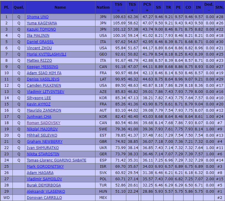 Лидируют японские фигуристы. На первом месте идёт Сёма Уно. Он набрал 109,63 балла. Вторым идёт Юма Кагияма. На его счету 105,69 балла. Замыкает тройку Казуки Томоно. Его прокат был оценён в 101,12 балла.