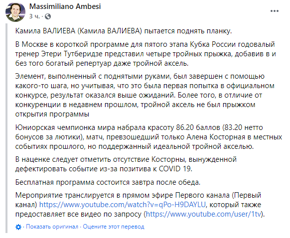 За свой прокат юная фигуристка получила 86.20 балла. Яркая программа Камилы не прошла мимо и известного итальянского обозревателя Массимилиано Амбеси, который на своей странице в facebook написал небольшой пост, посвящённый Камиле.