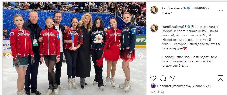 После окончания турнира Валиева опубликовала в Instagram новый пост, упомянув и команду-соперника - "Время первых", где капитаном была Евгения Медведева.