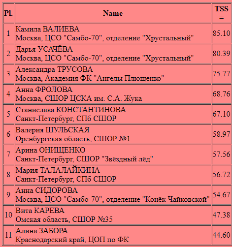 Ученица Евгения Плющенко Александра Трусова заработала за свой прокат 75.77 балла, заняв третью строчку в итоговом протоколе.