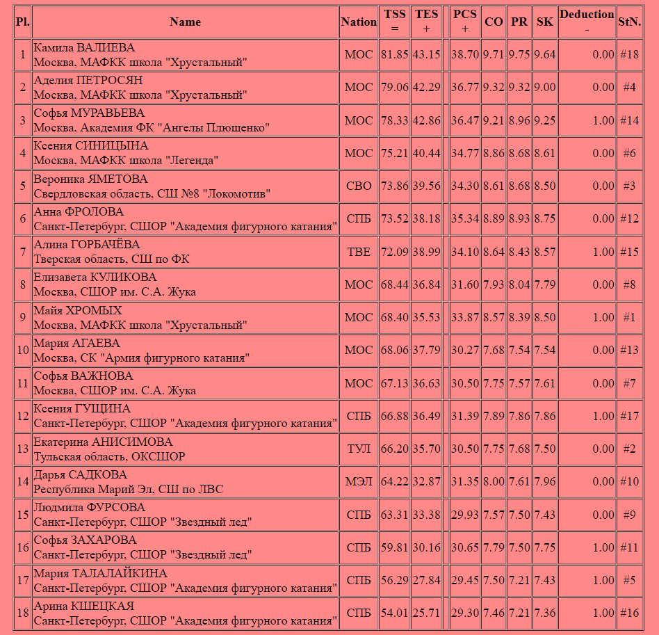 Первое место занимает Камила Валиева. Она набрала 81,85 балла. Второй идёт Аделия Петросян. На её счету 79,06 балла. Замыкает тройку Софья Муравьёва. Её прокат оценили в 78,33 балла.