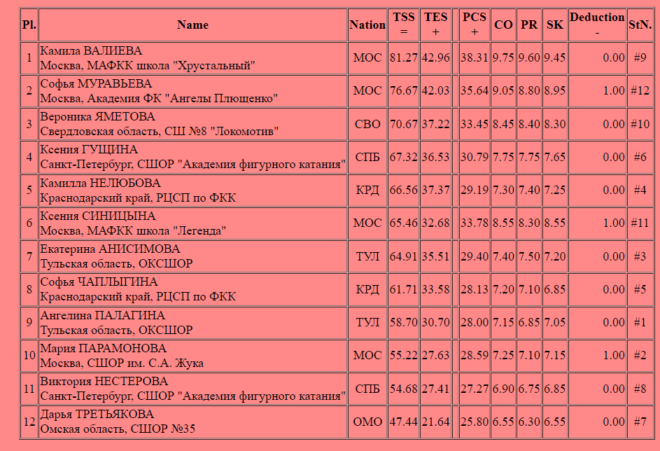Лидерство захватила Камила Валиева. Она набрала 81,27 балла. Второй стала Софья Муравьёва. На её счету 76,67 балла. Замкнула тройку Вероника Яметова. Её прокат был оценён в 81,27 балла.