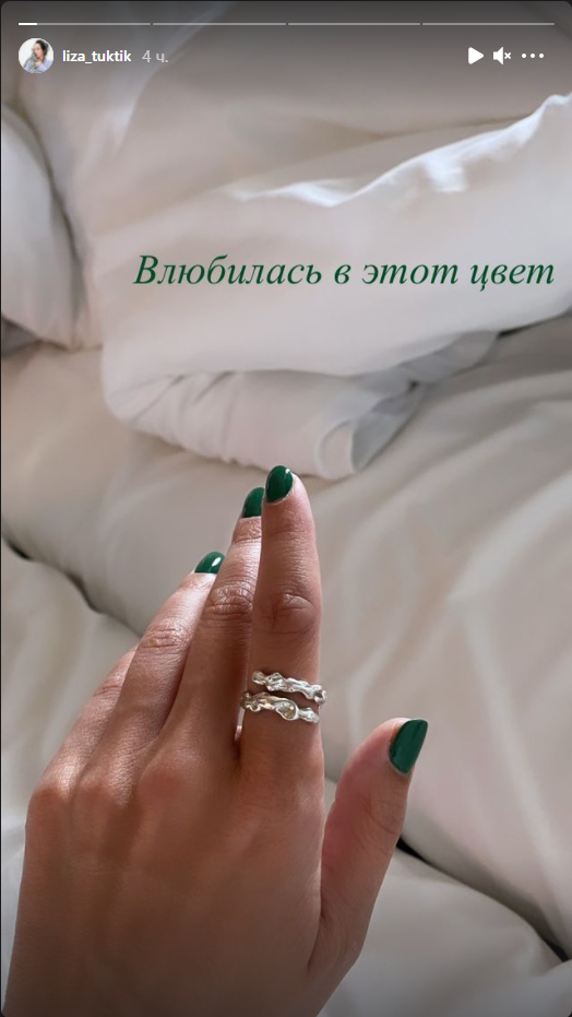 24-летняя спортсменка показала свои ногти. Она сделала маникюр зелёного цвета. Туктамышева написала, что влюбилась в этот цвет.