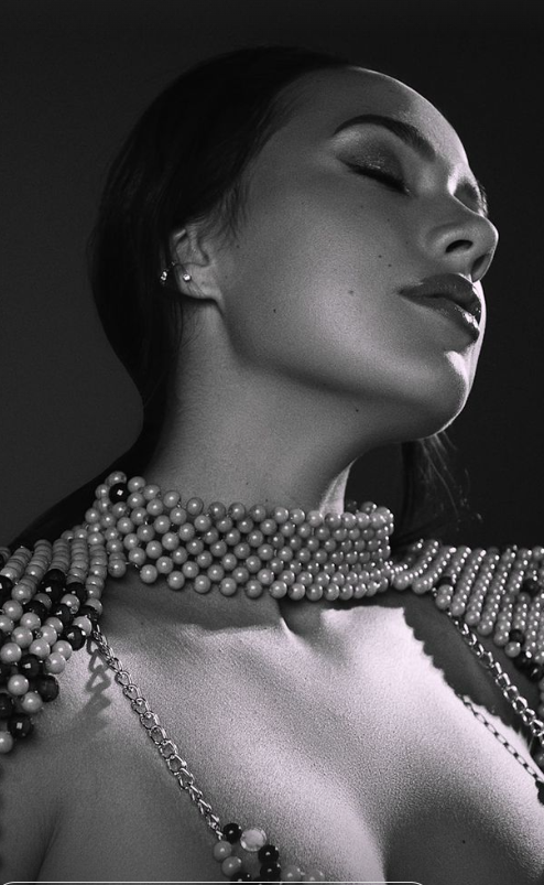 Не так давно у Загитовой была фотосессия в костюме из бус. Теперь она показала чёрно-белый снимок в этом же наряде.