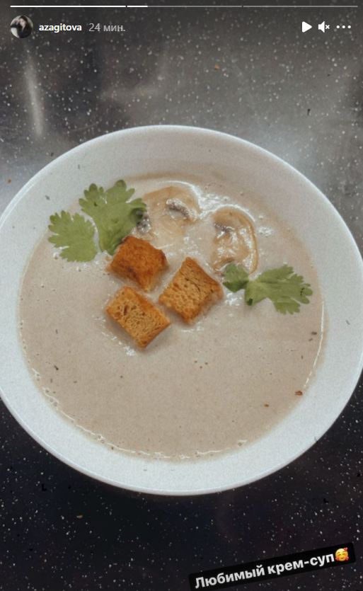 19-летняя спортсменка показала тарелку, в которой, вероятно, находится суп из шампиньонов. Она написала, что это её любимый крем-суп.