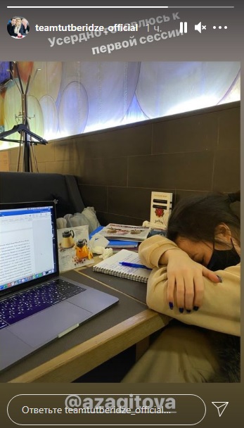 Соответствующее фото появилось в Instagram спортсменки. На снимке фигуристка сидит перед экраном ноутбука. Очевидно, что Алина устала от учёбы, поскольку она склонила голову и закрыла глаза."Усердно готовлюсь к первой сессии", - написала Загитова.