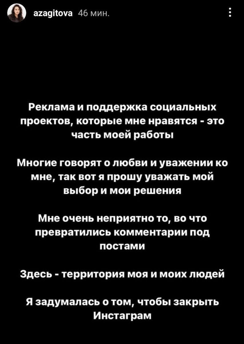 Я задумалась о том, чтобы закрыть Instagram, - написала Загитова.
