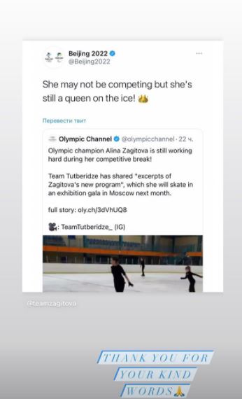 "Спасибо за ваши добрые слова", - ответила спортсменка у себя в сторис в Instagram.