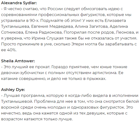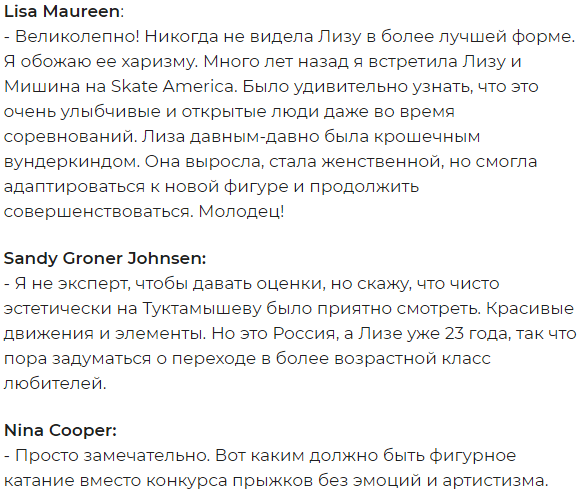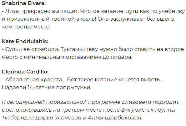 Ранее Автор проекта The Skating Lesson Дэвид Лиз также усомнился в справедливости баллов, которые получила Туктамышева за короткую программу.