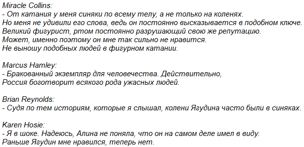 Реплику Алины подхватил сам Ягудин, заявивший, что юная Алина просто ещё не знает, что гематомы на коленях получаются от занятий совсем другим видом "спорта".