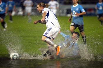 Ох, первенство российское! Ох, не может оно без скандалов. Очередным эпицентром плаванья неприятной субстанции по трубам общества стала Самара. И что бы вы думали? Снова газон на "Металлурге" оказался не травой, а чем-то, на чём в футбол играть нельзя. В Самаре идут дожди, которые превратили футбольное поле в добротную такую площадку для водного поло. Жаль, всего этого не понял арбитр Игорь Егоров, которому хватило смелости (или не хватило чего-то другого) разрешить проведение матча на подобном газоне. Смотреть за тем, как мучаются в лужах техничные и умные "динамовцы", как они пытаются на зло условиям творить на поле – было горько. Даже как-то порадовало, что Кевин Кураньи матч пропускал из-за перебора карточек – тонкая душа немца, привыкшая к прекрасному, вряд ли выдержала бы испытания самарским газоном.