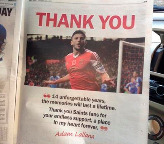 А пока Россия строит планы по покорению хоккейного мира в обоих полах, футбольные клубы Англии занимаются своим любимым занятием на лето – трансферами. "Ливерпуль" и "Саутгемптон" договорились о переходе полузащитника Адама Лалланы. И он, в свою очередь, часть подъёмных от ливерпульцев, потратил на то, чтобы выкупить полосу в газете Daily Echo. На ней он разместил слова благодарности поклонникам "Саутгемптона", за который отыграл 14 лет.