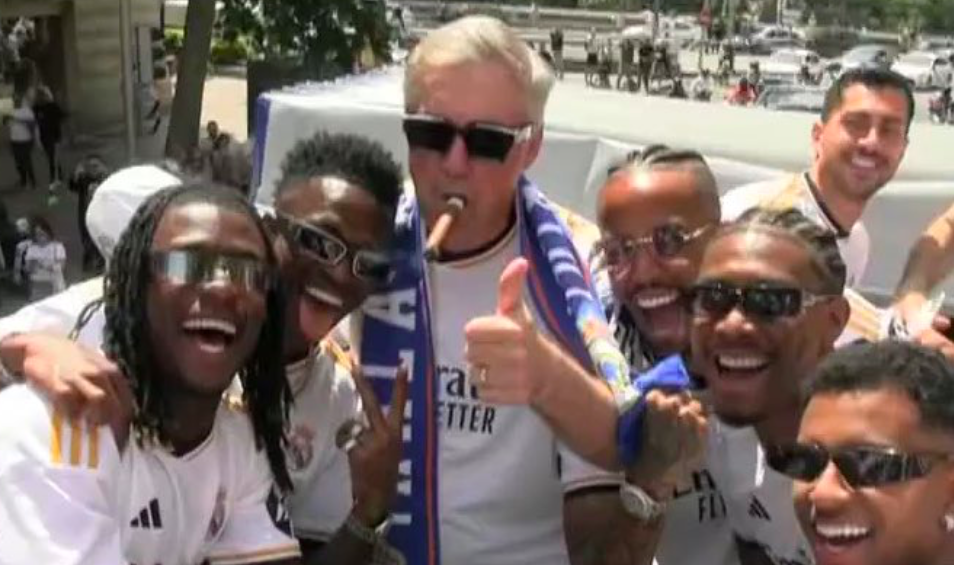 Автобус с футболистами и тренерами ездит по городу. Анчелотти во время парада сфотографировался с игроками. На нём были солнцезащитные очки, а во рту - сигара.
