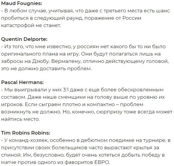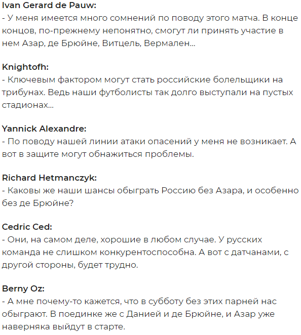 Игра пройдёт на местной "Газпром Арене" и начнётся в 22:00 по московскому времени. В преддверии поединка в северной столице России болельщики "красных львов" на страницах популярного сайта voetbalprimeur.be поделились ожиданиями от стартового матча своей команды на Евро.