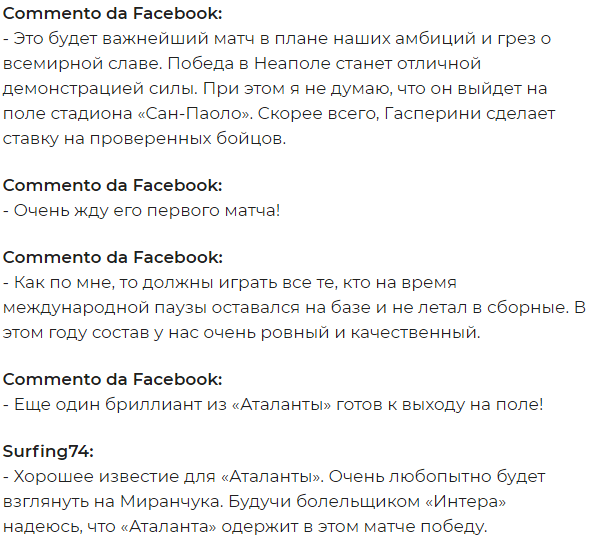 Накануне главный тренер итальянской "Аталанты" Джан Пьеро Гасперини заверил болельщиков команды, что новоиспечённый футболист клуба Алексей Миранчук сможет дебютировать в Серии А уже в ближайшем поединке против "Наполи"