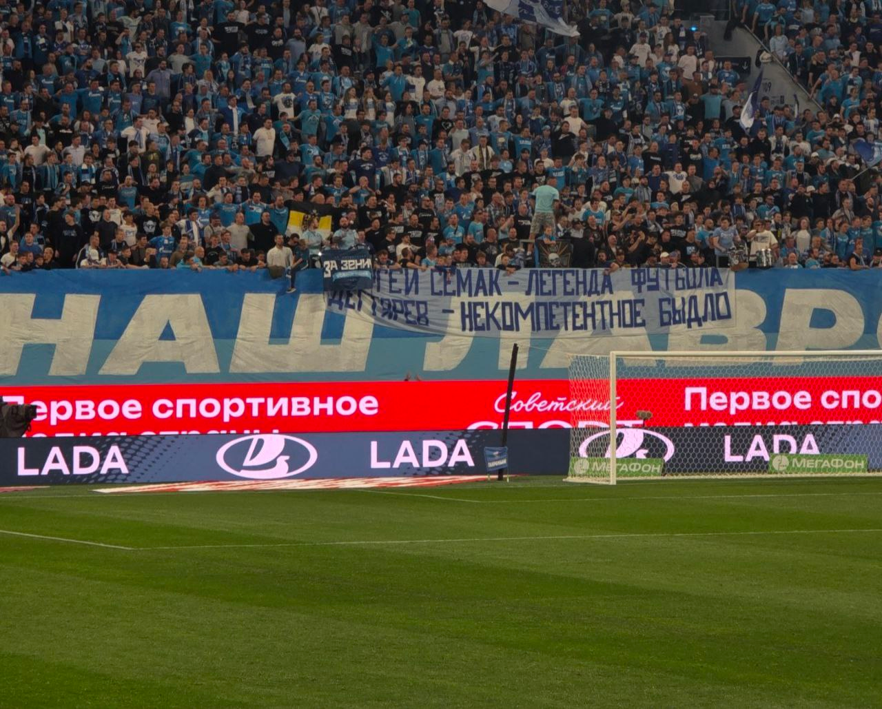 "Сергей Семак — легенда футбола, Дегтярёв — некомпетентное быдло, — гласит текст на баннере болельщиков "Зенита".