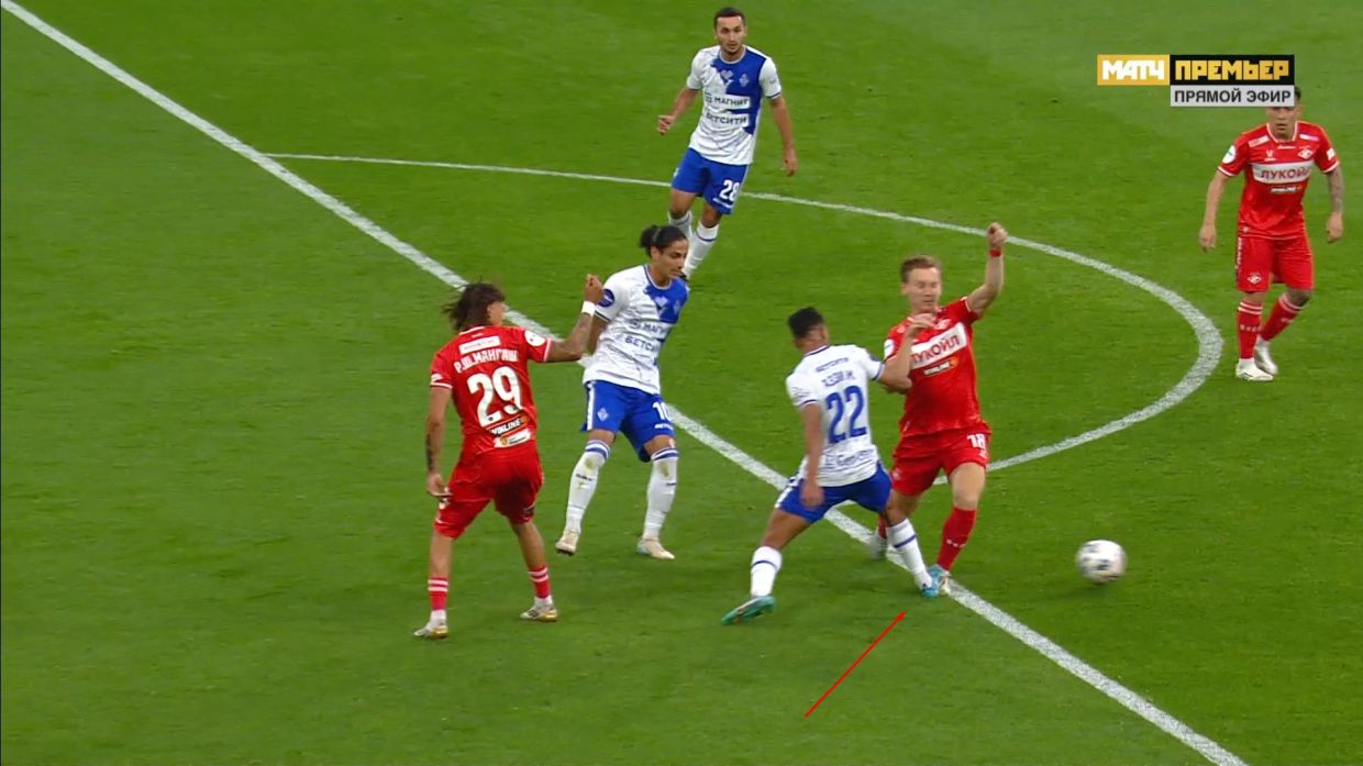 Арбитр Василий Казарцев не назначил пенальти после того, как один из игроков махачкалинцев наступил на ногу полузащитнику "Спартака" Наилю Умярову в своей штрафной.
