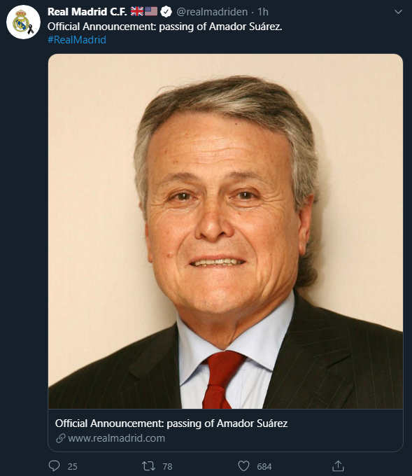 Во вторник, пятого мая, официальный сайт мадридского "Реала" сообщает о том, что бывший вице-президент королевской команды Амадор Суарес скончался от коронавируса