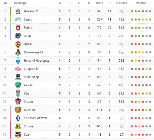 "Динамо" вырвалось на первое место в чемпионате России: турнирная таблица РПЛ