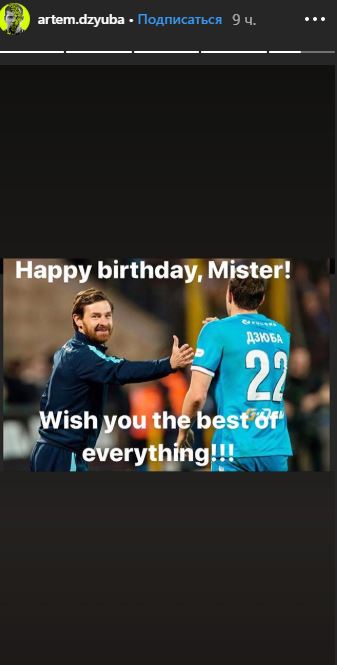 31-летний форвард питерского "Зенита" и сборной России Артём Дзюба поздравил с днём рождения экс-тренера "Зенита", а ныне менеджера "Марселя" Андре Виллаш-Боаша, которому 17 октября исполнился 41 год.
