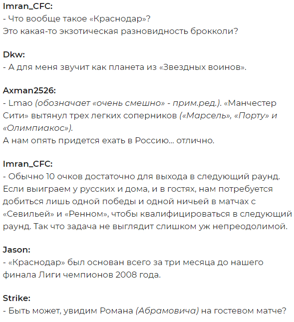 Судя по оставленным комментариям, избалованная лондонская торсида мало знакома с российским футболом, единственное что пугает фанатов "Челси", так это далёкий вояж в России, где находится загадочный для них город Краснодар: