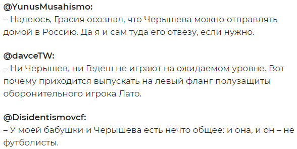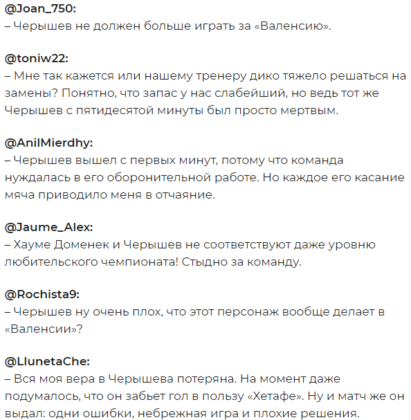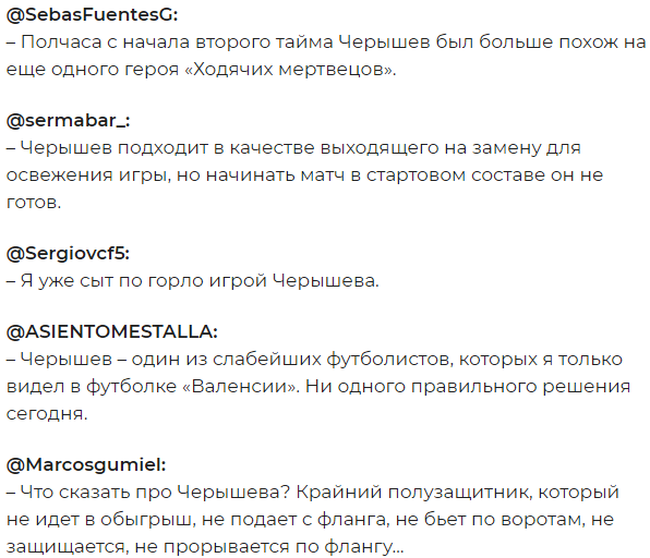 Ничья на легендарном стадионе "Месталья" очень раздосадовала фанатскую торсиду "Валенсии", а главным виновников неудачного результата в глазах болельщиков стал российский полузащитник Денис Черышев, покинувший поле на 77-й минуте матча.