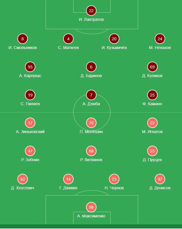 "Локомотив": Лантратов (гк), Кузьмичев, Ненахов, Смольников, Магкеев, Карпукас, Баринов, Куликов, Пиняев, Дзюба, Камано.