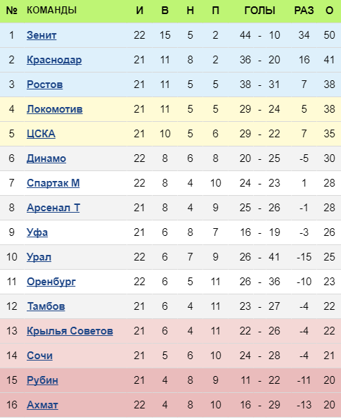 На текущий момент три игры 22-го тура РПЛ уже сыграны, таблица чемпионата выглядит следующим образом: