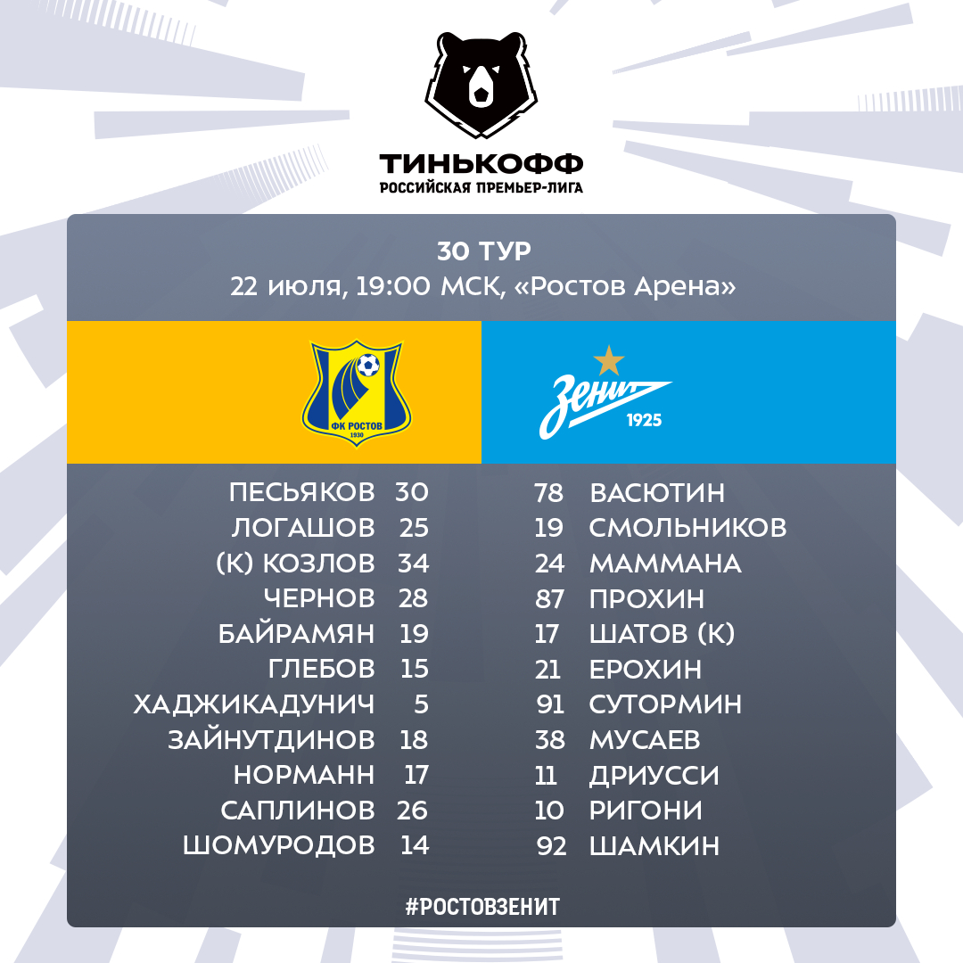 Здравствуйте, уважаемые поклонники футбола! Сегодня мы прощаемся с очередным сезоном Российской Премьер-Лиги и предлагаем вам понаблюдать за битвой команд в заключительном туре чемпионата страны. Прямая текстовая трансляция поединка между командами "Ростов" и "Зенит" пройдёт здесь, начнётся она в 19:00, а проведу её для вас я, Александр Петряков. Жду вас к мониторам и желаю приятного чтения!