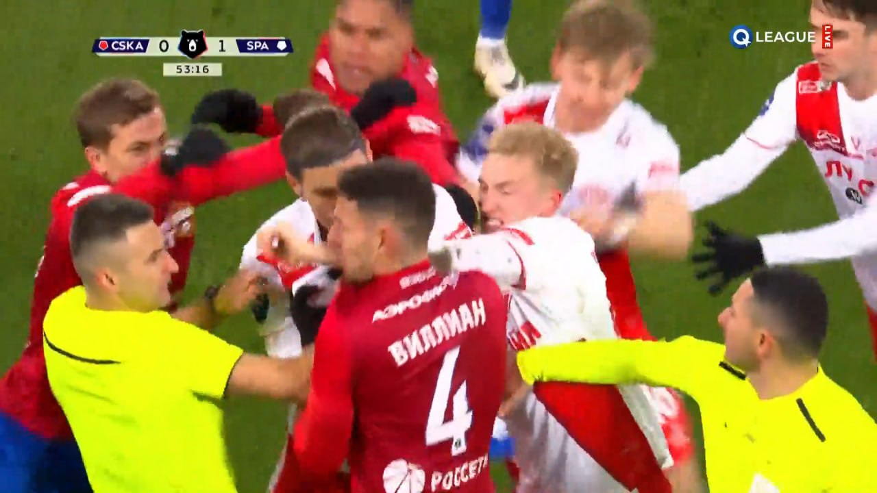 А следом уже небольшая потасовка! Грубо сыграл Бонгонда! Ударил сзади по ногам Кругового, а дальше уже Виллиан Роша пошёл разговаривать с Тео!
